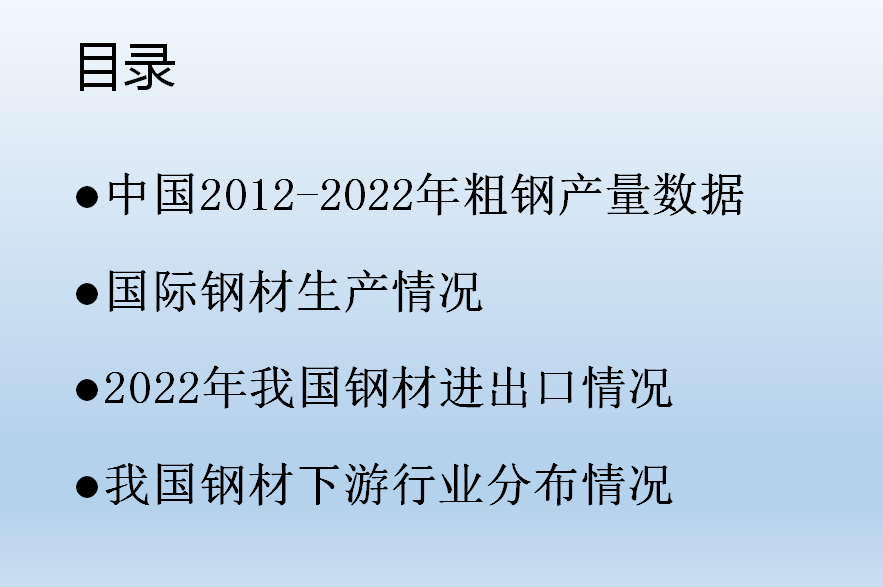•我國現(xiàn)階段已經初步實現(xiàn)城鎮(zhèn)化的建設,隨著房地產需求的下滑,我們普通鋼材很難有一個大的增量,但是我國的特殊鋼材還有很大的發(fā)展空間。結合國家鋼材發(fā)展現(xiàn)狀,我們也慢慢的理解公司制定“高端、國有、人無我有”政策的現(xiàn)實依據,希望大家能出通過了解行業(yè)發(fā)展的方向,明確目標,開發(fā)客戶,更好的規(guī)劃自己的銷售,取得好的業(yè)績。